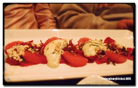 Marinated roasted beetroot, goat cheese mousse, grapefruit frozen vinaigrette and basil.