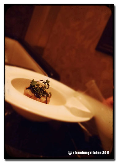 with avocado, yuzu, puffed wild rice, ponzu foam, kaffir lime wasabi and fog.  Not quite sure how the fog contributed to the dish though.