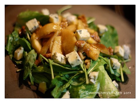 It’s really not the greens but what goes with it that I love. Imagine… sweet caramelized apples and raisins with chunks of blue cheese and bits of bacon. A winner through and through, don’t you think? But because I can have that prepared for me once or twice a week, I thought to use this as inspiration instead. I loosely adapted Donna Hay’s recipe and came up with this terrific salad. It has the same sweet-savory combination that goes so well with the peppery taste of Arugula but with an added crunch from the walnuts.