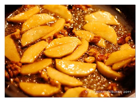 - Add the apple and walnuts and cook for 4 minutes or until apples are just soft.