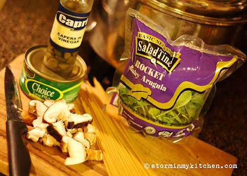 Cook the pasta as the pack directs.  Meanwhile, sauté the capers with a bit of oil from the can, add the mushrooms and sauté for another minute or until the capers starts to crisp.  Stir in the tuna with half of the oil from the can, adding more depending on your preference (I like mine drier).  Add the dill and a bunch of arugula.  Let it simmer until the arugula starts to wilt. Season with chili flakes, salt and freshly cracked pepper.  I chose to have it with pasta, but this dish goes well with pasta, rice, and oatmeal or even on top of sliced baguette.