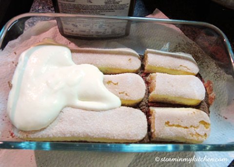 6. Pour rest of Espresso into a flat dish, dip one side of each Lady Finger, and layer on bottom of serving dish.