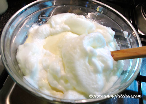 4. In another bowl, combine 3 egg whites and a pinch of sugar. Beat until mixture forms stiff peaks.