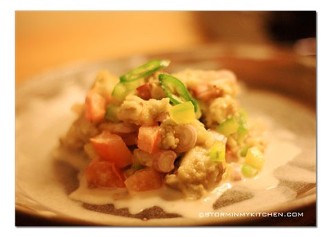 This is not about fancy food fare.  This salad accompanies almost any ‘inihaw” (grilled) dish that might be served during a fiesta or in my case, any gatherings at home.  Easy to put together and never fails to liven up a table of food fare.  I think this dish paved the way to my loving eggplants.