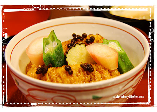 For the main course, I chose Donburi with Sea Bream marinated in Miso. It tastes as good as it looks. Also called Japan’s king of fish, the sea bream is very flavorful, meat firm similar to sea bass. The miso delicately seasoning the fresh flavor of the fish.