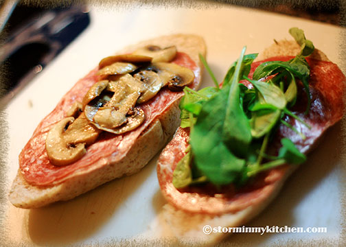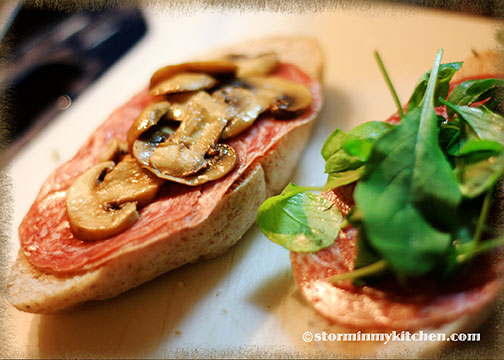 A few nights ago, I layered generous slices of Milano salami (I always have those on hand), sliced brown mushrooms (sautéed in olive oil, seasoned with salt and pepper), and arugula on whole wheat focaccia bread.