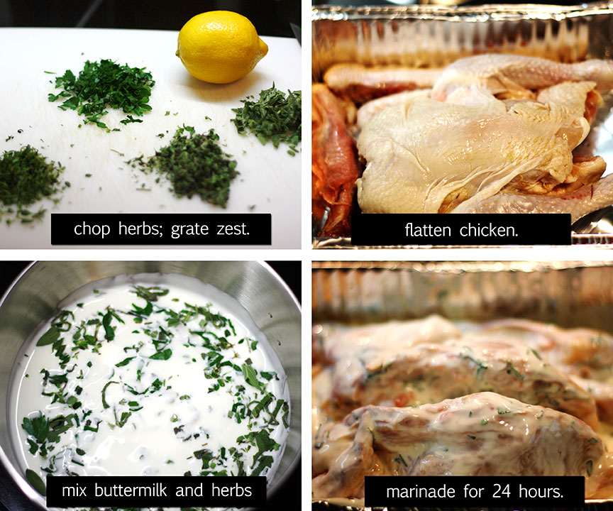 For whole chicken: lay the breast side down on a chopping board. Cut the backbone (using a kitchen shear is the easiest way to do this). Turn the chicken over and flatten. Combine buttermilk with a handful of herbs and pour over the chicken in a dish. Cover and keep refrigerated for 24 hours.